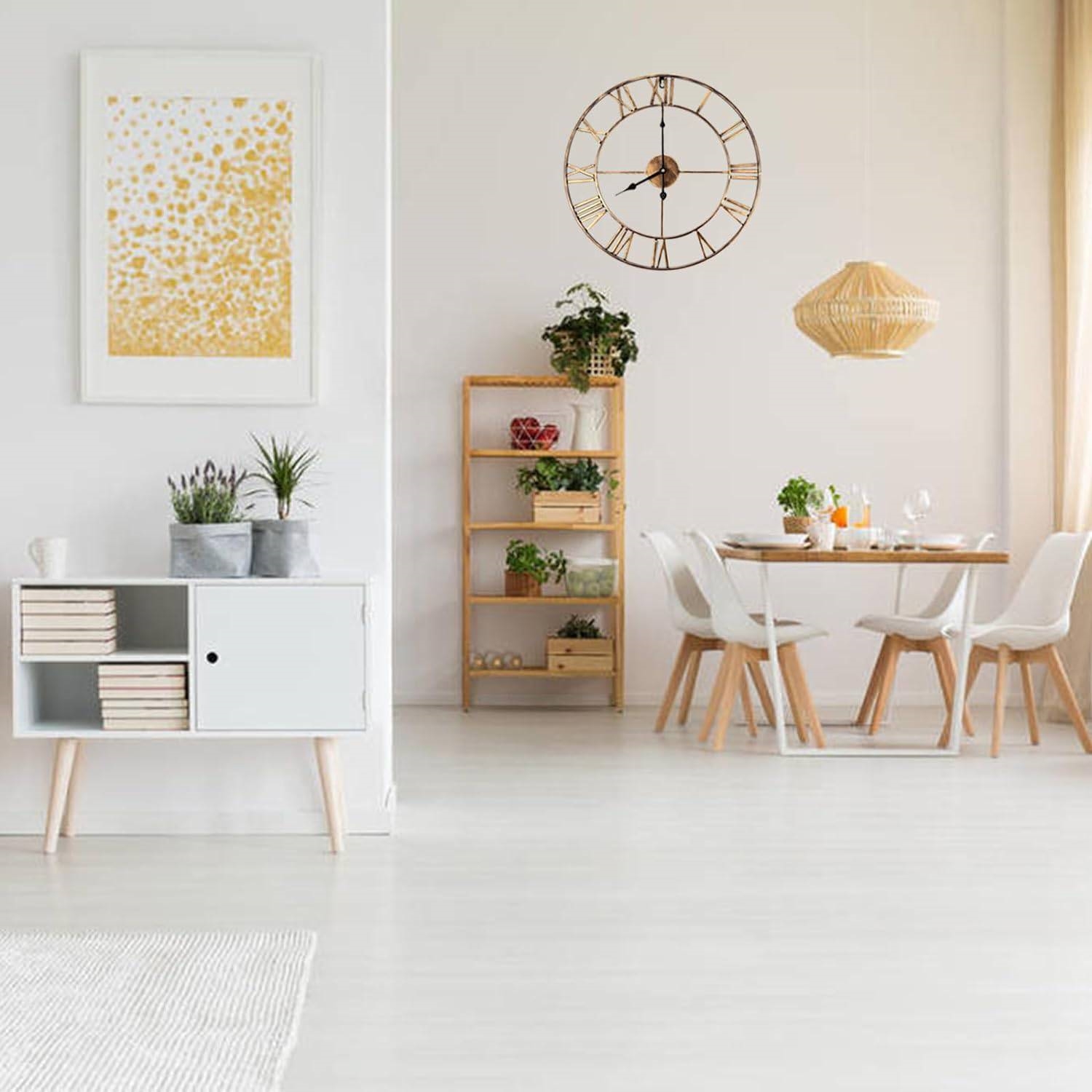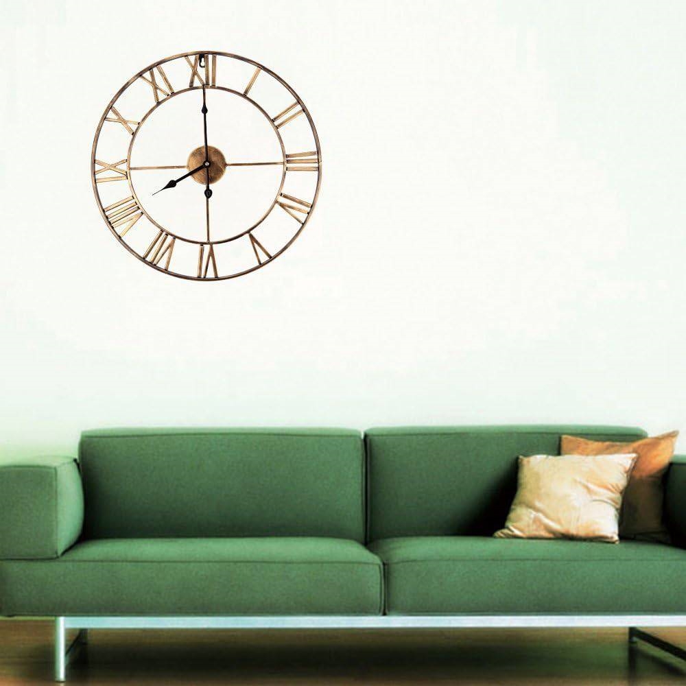 This Decorative 18.5-inch Roman Numerals Silent Non-Ticking Wall Clock in Gold is an oversized iron wall clock with European retro style and no frame surface. Enjoy a vintage display on the wall with a fashion pattern available, best decoration. Diameter: 18.5”(47cm) Classic and elegant and looks great on the wall of the living room, bedroom, kitchen, hallway, office, study, cafe, hotel, restaurant etc. Handmade iron metal, classic industrial Roman Numerals, with hand painted vintage color. Famous Qualify Quartz Sweep Movement and no second design guarantees accurate time & absolutely silent environment. Recommended AA ordinary Carbon Zinc or Heavy Duty battery (NOT Included), excluding Alkaline battery.
