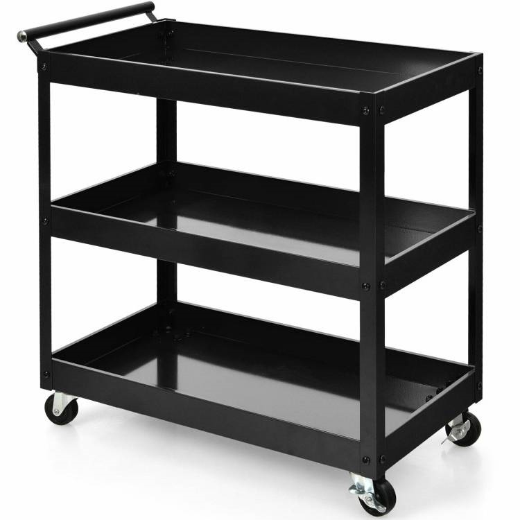This Black Steel Frame Kitchen Serving Utility Cart on Wheels with 2 Bottom Shelves features spacious storage space, which can hold all kinds of items at one time and sort them neatly. The upper layer can place some commonly used items for easy access, while the lower layers can hold different tools to improve work efficiency. Adopting sturdy steel construction, this heavy-duty service cart has a high load-bearing capacity, and each tier can hold up to 55 lbs. Durable shelves will not rust or dent easily, so they can be a great addition to your work area. Equipped with 4 flexible rotating casters (2 lockable), you can move the utility cart to any place without effort. And the brake system makes it convenient for you to stop the cart as needed. Besides, there is a humanized handle for convenient control when moving it around. This multi-functional service cart is suitable for various occasions, such as home, office, restaurant, workshop, garage, warehouses and more. In addition, the service cart with compact size is perfect for small apartments with limited space, and you can use it to store books, tools, etc. Comes with detailed instructions and complete accessories, you can complete the installation in a short time. Moreover, the smooth surface is easy to clean with a wet cloth, which helps to save time and energy.