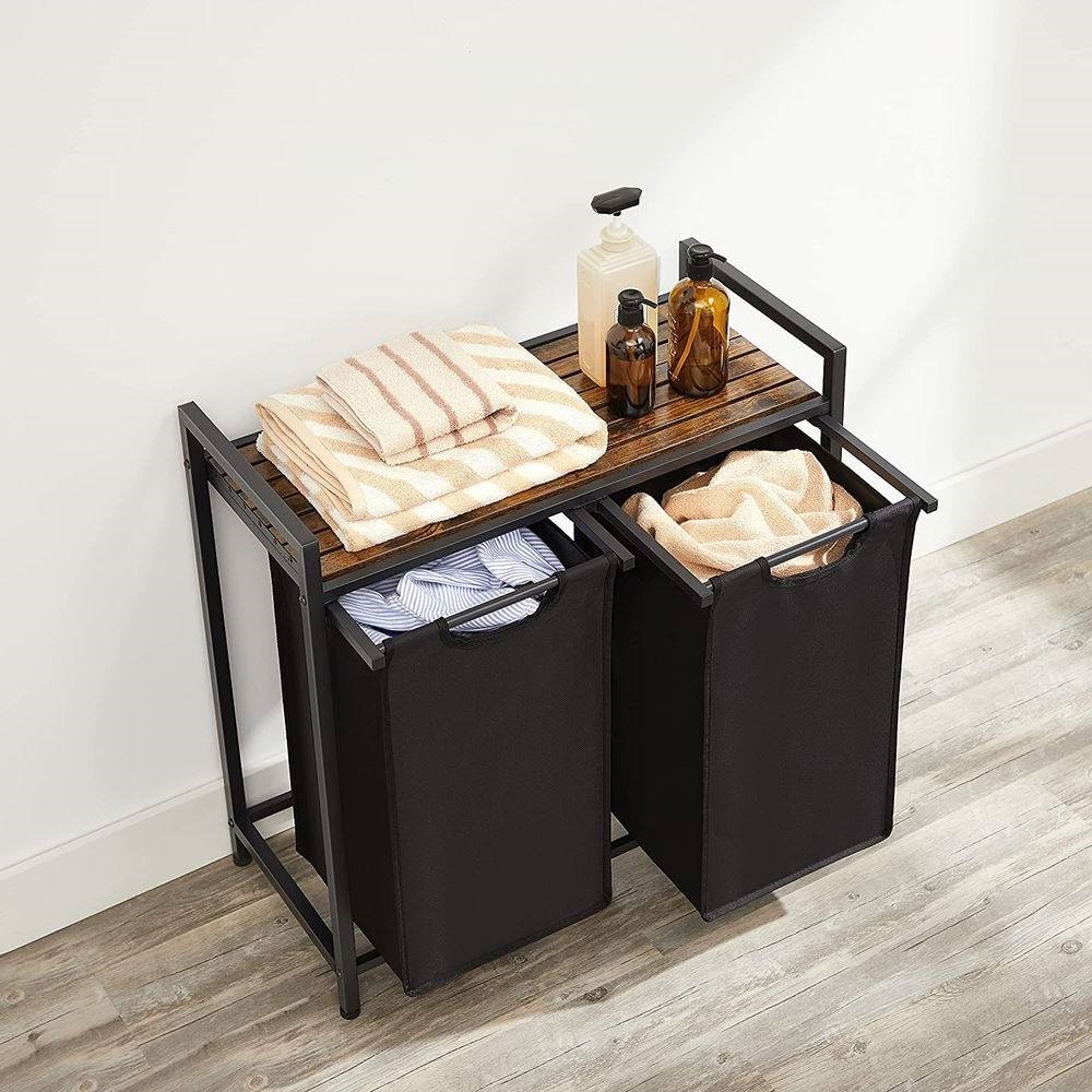 So many storage options that this Metal Wood Industrial Modern Laundry Sorter Hamper Black/Brown can offer you! 2 pockets made of Oxford fabric help you sort laundry by color, and a top shelf keeps detergent and fabric softener handy. Crafted of particleboard and steel, this laundry basket will stand steady and firm! The adjustable feet and anti-tip kits help prevent unwanted wobbles or accidental tipping.